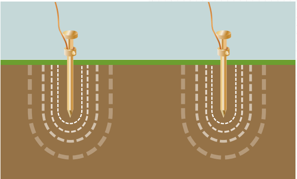 接地电极被周围的土地所环绕,土地从概念上讲是由一系列同心土壤层组成的,这些土壤层的厚度相同。最靠近接地电极的土壤层的面积最小,从而导致其电阻最大。每个下一个土壤层的面积越大,从而导致其电阻越小。这样最终会达到某个点,此外的土壤层对接地电极周围的土地电阻影响非常小.