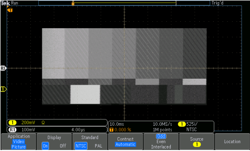 查看 NTSC 全彩条信号图像。 视频图像模式包含了自动对比度和亮度设置以及手动控制。