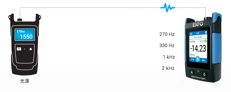 在进行光纤追踪时,Optical Power Expert可检测来自光源的四个不同的音频信号a:270 Hz、330 Hz、1 kHz和2 kHz。