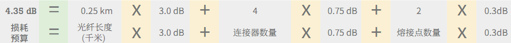 例:光纤链路长度为250 m,有四个连接器和两个熔接点,则预算为: